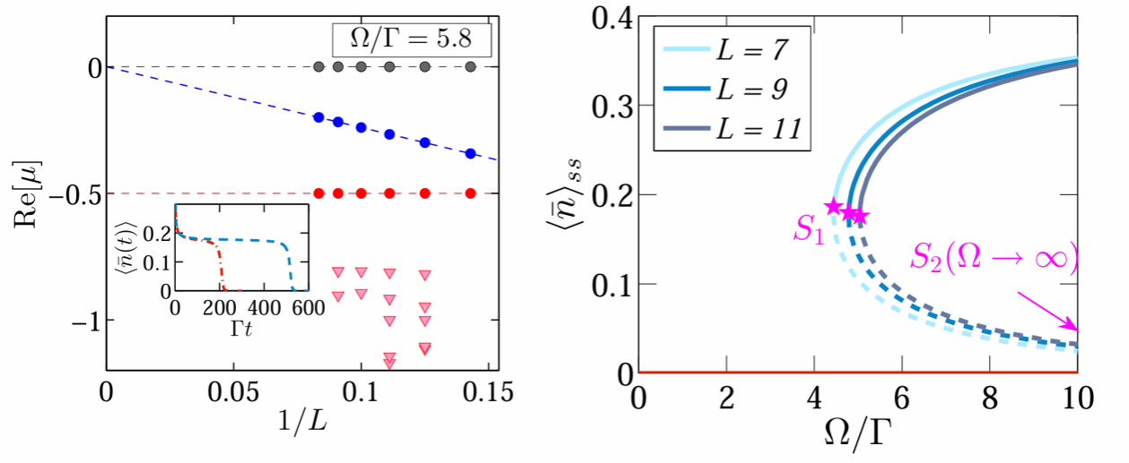 非平衡相變是量子物理、凝聚態(tài)與統(tǒng)計(jì)物理領(lǐng)域的重要研究方向,接觸過(guò)程是非平衡穩(wěn)態(tài)相變中的一個(gè)典型模型,其在模擬流行病動(dòng)力學(xué)、信息擴(kuò)散等過(guò)程中發(fā)揮重要作用。然而,將該模型擴(kuò)展至量子系統(tǒng)時(shí),由于量子相干演化與耗散之間的相互競(jìng)爭(zhēng),導(dǎo)致系統(tǒng)穩(wěn)態(tài)呈現(xiàn)許多新奇特性。量子接觸過(guò)程的一個(gè)顯著特征是在一維體系中可表現(xiàn)出從吸收相到活躍相的穩(wěn)態(tài)相變。但是此類相變屬于連續(xù)相變還是非連續(xù)相變?nèi)源嬖谳^大爭(zhēng)議,是該方向的研究焦點(diǎn)。而且該問(wèn)題涉及非幺正演化和復(fù)雜多體作用,具有較大的挑戰(zhàn)性。