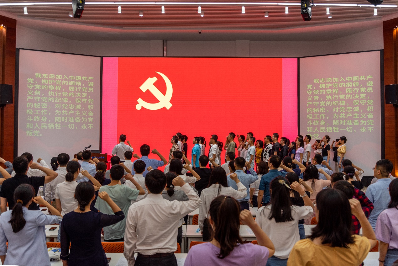 表彰大會在莊嚴(yán)的國歌中啟幕。學(xué)院黨委書記王正洶帶領(lǐng)全體新發(fā)展黨員在黨旗下進(jìn)行宣誓,到會的其他黨員重溫入黨誓詞。