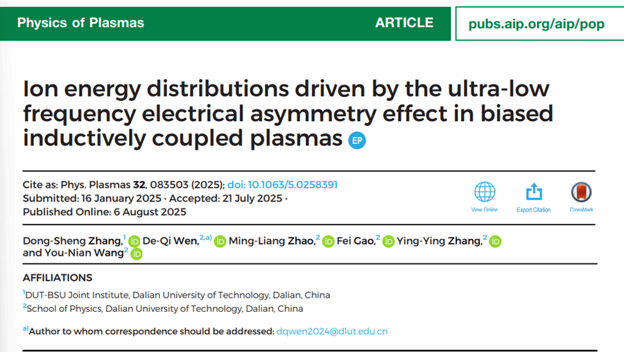 近日,我校中白學(xué)院2022級本科生張東升在偏壓感性耦合等離子體離子能量調(diào)控的研究工作被國際等離子體物理領(lǐng)域主流期刊Phys. Plasma發(fā)表,并被編輯選為Editors’ Pick, 在雜志主頁專欄刊載。論文題目為 “Ion energy distributions driven by the ultra-low frequency electrical asymmetry effect in biased inductively coupled plasmas”,其中張東升為第一作者;物理學(xué)院的溫德奇教授為通訊作者;物理學(xué)院趙明亮博士后、高飛教授、張瑩瑩高級工程師和王友年教授為共同作者。