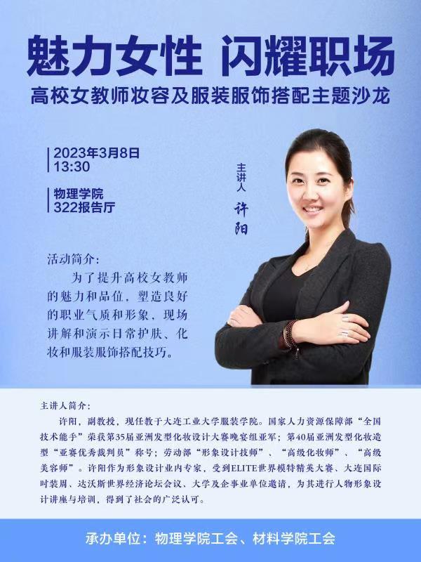為慶祝“三八”國(guó)際婦女節(jié),增加女教職工會(huì)員職業(yè)幸福感,物理學(xué)院工會(huì)聯(lián)合材料學(xué)院工會(huì)組織了一次主題為“魅力女性,閃耀職場(chǎng)”的服飾搭配講座沙龍活動(dòng)。本次講座旨在為兩學(xué)院廣大女教師提供一個(gè)學(xué)習(xí)交流的平臺(tái),讓各位女教師更好地了解妝容及服裝服飾搭配技巧,提高自身形象和氣質(zhì),更加自信地展現(xiàn)自己的風(fēng)采。講座活動(dòng)邀請(qǐng)了大連工業(yè)大學(xué)服裝學(xué)院的許陽(yáng)副教授。許陽(yáng)老師在服裝設(shè)計(jì)和搭配方面有著豐富的經(jīng)驗(yàn)和獨(dú)到的見(jiàn)解,專(zhuān)業(yè)能力得到了社會(huì)的廣泛認(rèn)可。在活動(dòng)籌劃期間,兩院工會(huì)面向女教職工會(huì)員進(jìn)行了線上和線下多種形式的活動(dòng)宣傳。
