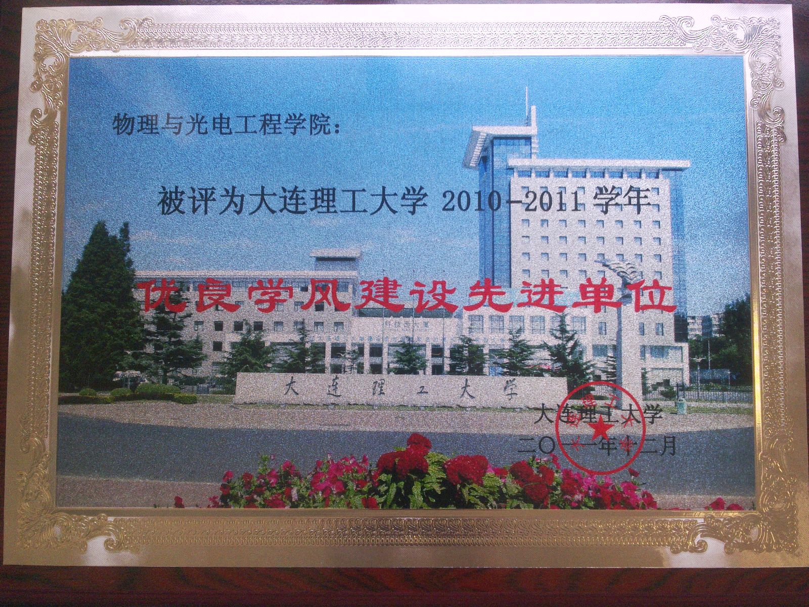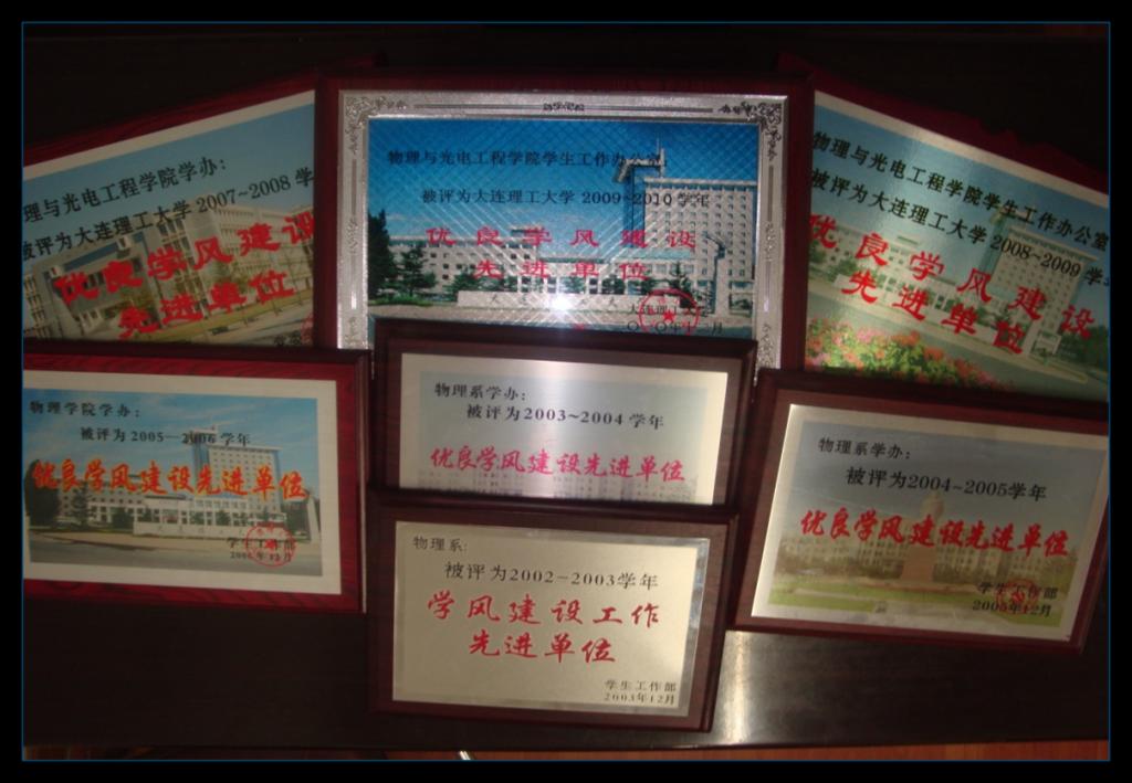 2011年12月,物理與光電工程學(xué)院榮獲大連理工大學(xué)2010-2011“學(xué)年優(yōu)良學(xué)風(fēng)建設(shè)先進單位”榮譽稱號,于近9年中第8次獲此殊榮。