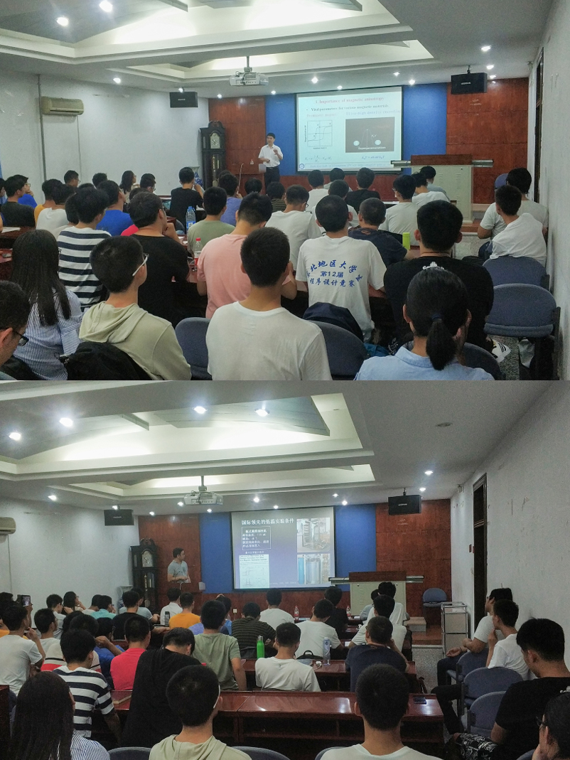 9月12日晚,物理學(xué)院322會議室開展“科學(xué)家面對面”專題學(xué)術(shù)報告活動,中科院物理所成昭華、程智剛兩名研究員先后做專題學(xué)術(shù)報告。其中國家杰出青年基金獲得者,中科院百人計劃入選者成昭華研究員做《磁性納米結(jié)構(gòu)與飛秒磁性》專題報告、中科院百人計劃特聘研究員程智剛做《量子計算與拓撲超導(dǎo)體》專題報告,講座現(xiàn)場座無虛席,聽會學(xué)生反響熱烈。報告環(huán)節(jié)結(jié)束后,物理所研究生部科教結(jié)合業(yè)務(wù)主管汪庭語老師就“嚴濟慈班”招生詳情進行宣講。
